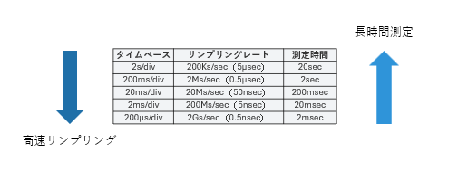 サンプリングレートが高速になるほど、使用するメモリが増え測定時間は短くなります。